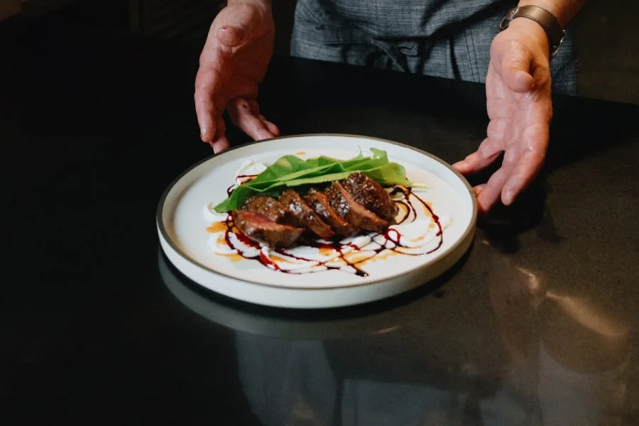 Speckle Park bavette, red witloof, beetroot, whipped almond butter / 44