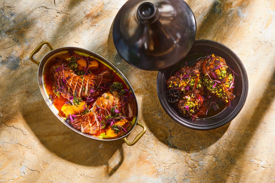 Duck leg shish, sheep’s curd, red chermoula, hazelnut dukkah / 28