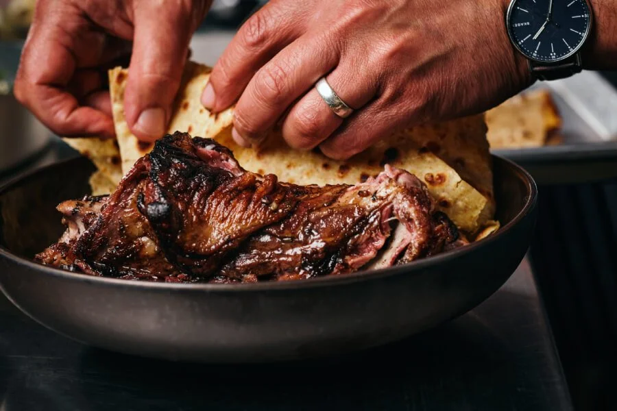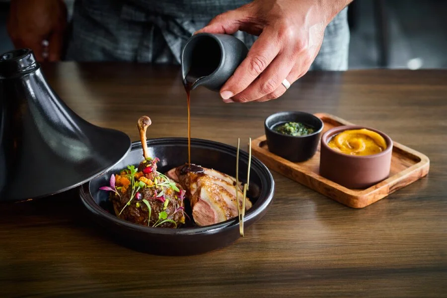 Duck leg shish, sheep’s curd, red chermoula, hazelnut dukkah