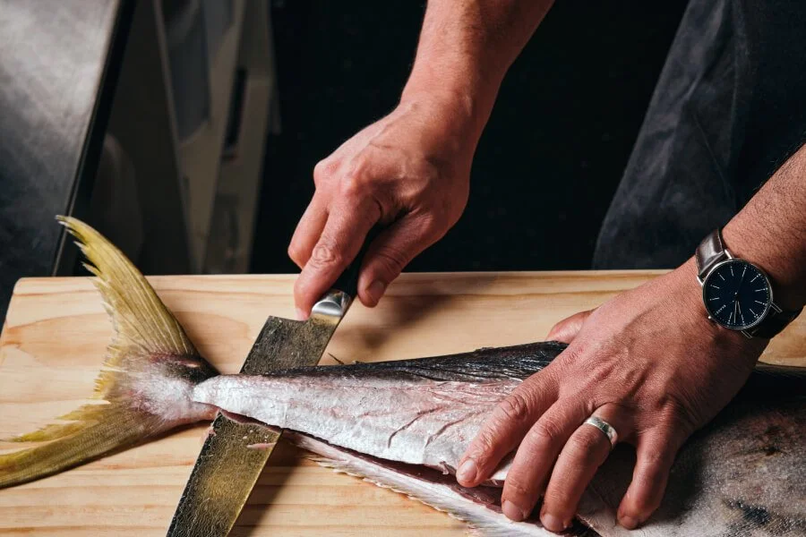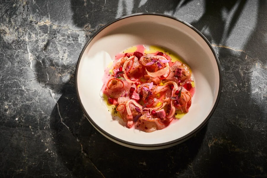 Cold-smoked Haku kingfish, pickled shallot, hung yoghurt, radish, harissa XO / 30