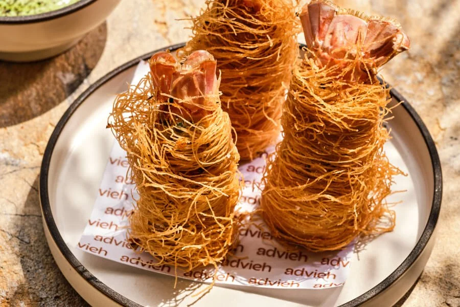 Crispy scampi and crayfish kataifi, cacik, black Aleppo / 21 ea
