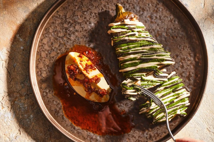 Whole eggplant, green tahini, toum, chilli crisp, aromatic herbs / 33
